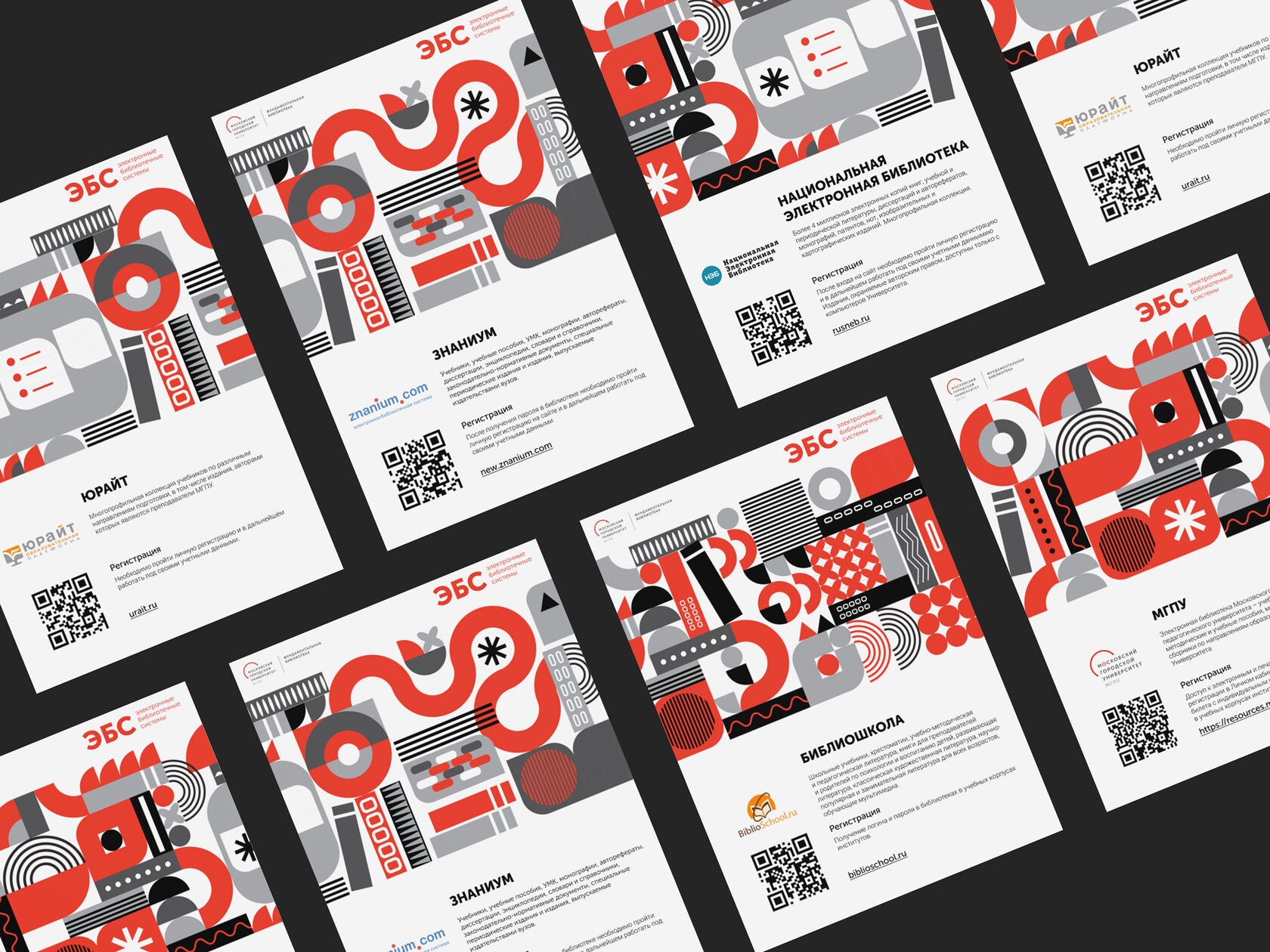Собрала паттерн в фирменных цветах МГПУ. Сделала макет формата А4, чтобы его можно было легко распечатать на цветном принтере прямо в Библиотеке. Филиалы МГПУ могут не заказывать печать своих ЭБС, а выбрать нужные и распечатать самостоятельно. Все макеты ЭБС выполнены в едином стиле. Заодно обновили вывески стеллажей с новым паттерном.